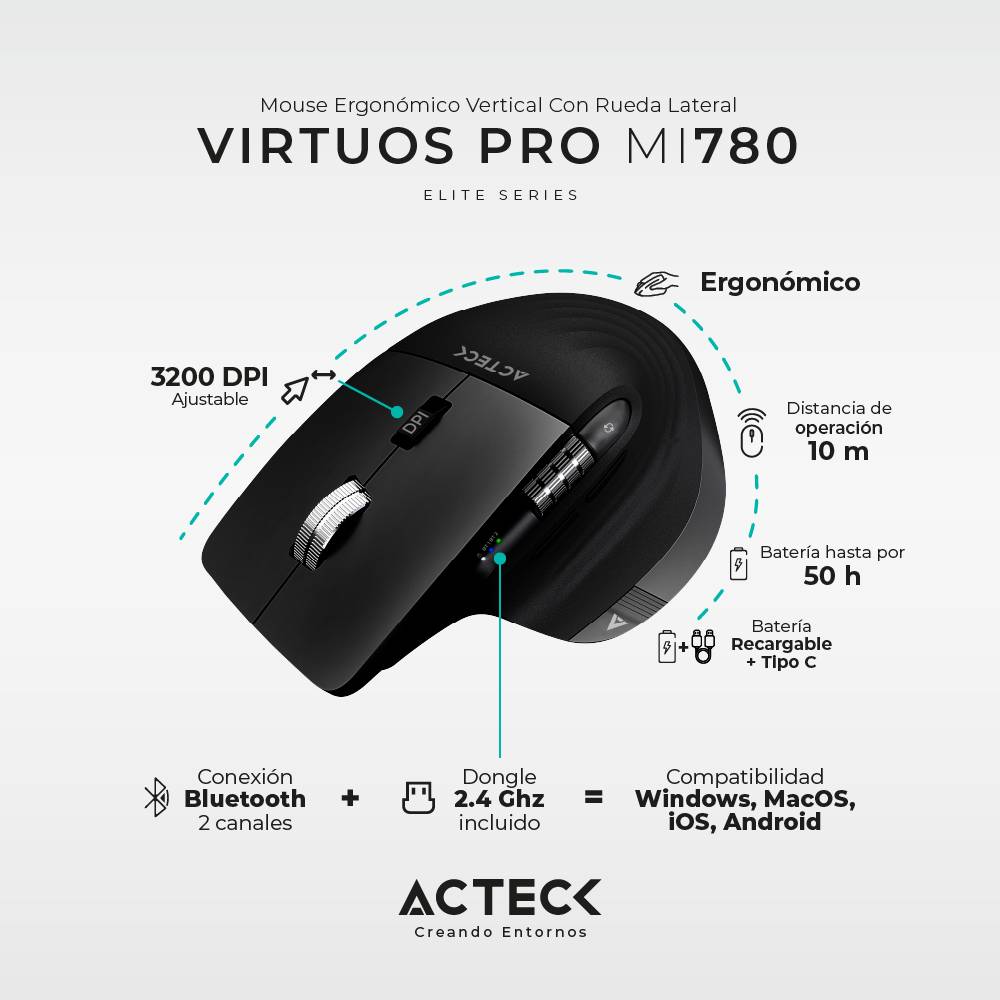 Mouse Inalámbrico Vertical Profesional Virtuos Pro MI780 ACTECK Scroll Horizontal Ultra Fast de acero, Batería recargable 500 mAh, Hasta 90 hrs, Bluetooth 2 Canales y Dongle 2.4 GHz, 10m de alcance, Puerto de carga USB-C, Compatible con Win8 / Win10 / Win11 / MacOS iOS / Android. Resolución, Hasta 3200 DPI, 8 Botones, Negro. AC-936187